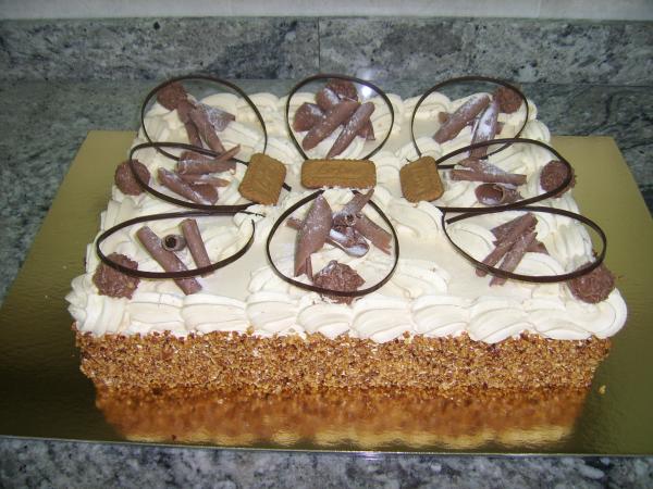 Ce gâteau est composé d'un croustillant spéculoos, recouvert de mousse vanille et ensuite de mousse caramel, il est fini lisse pour les ronds et avec des rosaces des deux mousses mélangées pour les carrés ,ils sont décorés de bonbons spéculoos avec des cerceaux de chocolats et d'un biscuit spéculoos.